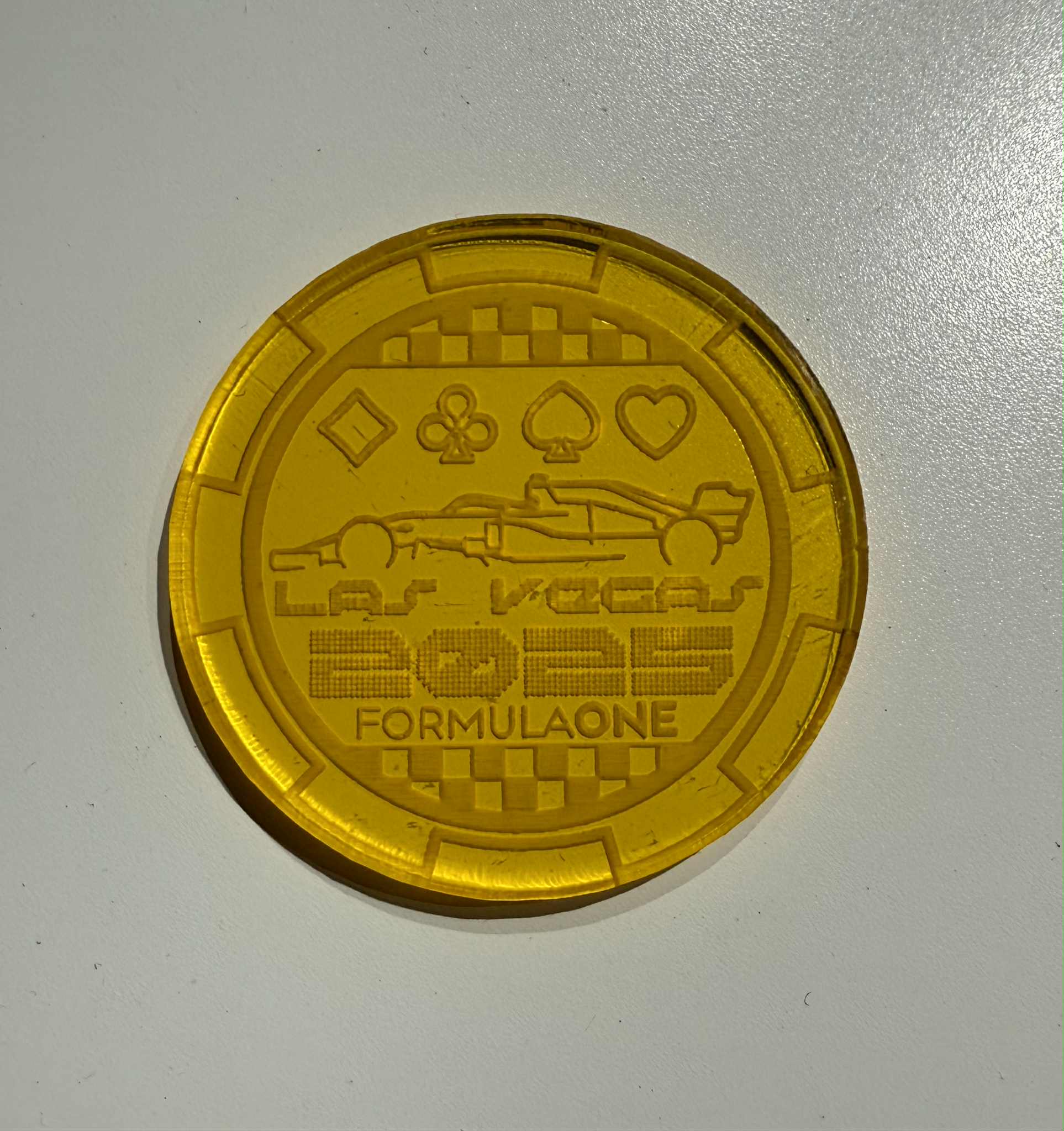 Limited Edition Collectable Las Vegas Race 2025 – 1.5″ yellow/gold acrylic and laser engraved design 1/8″ thick